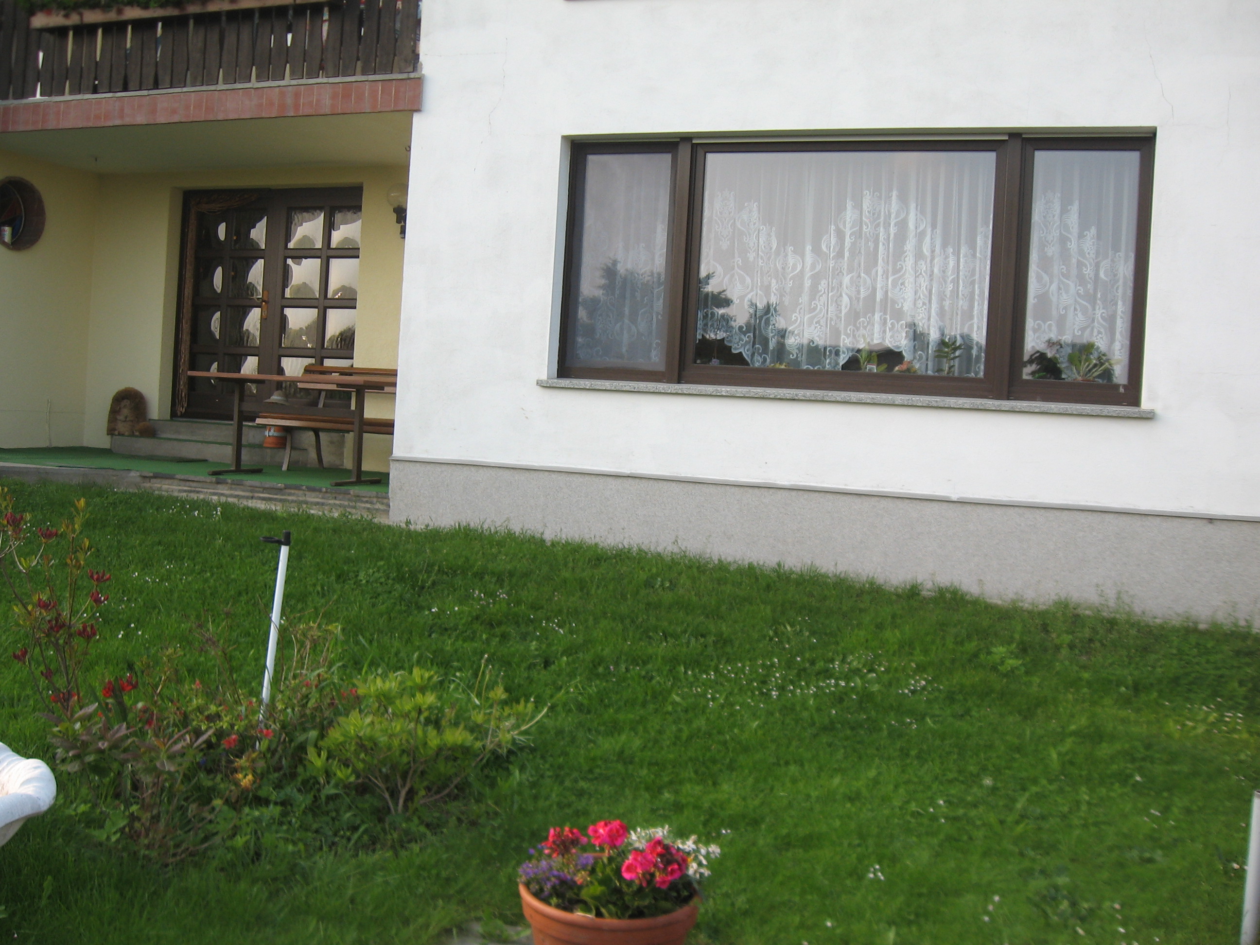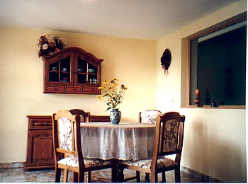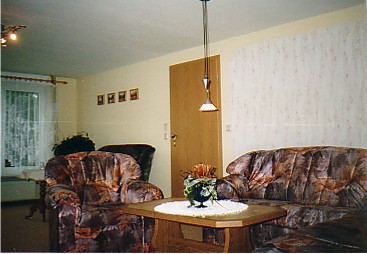 Unsere Feriengäste wohnen in einem sehr ruhig, direkt am Waldrand gelegenen Zweifamilienhaus, im Erdgeschoss mit seperatem Eingang. Die Wohnung (ca. 90 m²) bietet 2 bis 4, mit Aufbettungen auch 6 Personen, ausreichend Platz. Sie verfügt über ein großes Wohnzimmer, einen Schlafraum mit Doppel- und Etagenbett, einem Eßzimmer, einer komplett ausgestatteten Küche und einem Bad mit Wanne, Dusche und WC. Vor der Wohnung befindet sich der Garten, von dem aus man eine wunderschöne Aussicht auf die umliegende Landschaft hat.